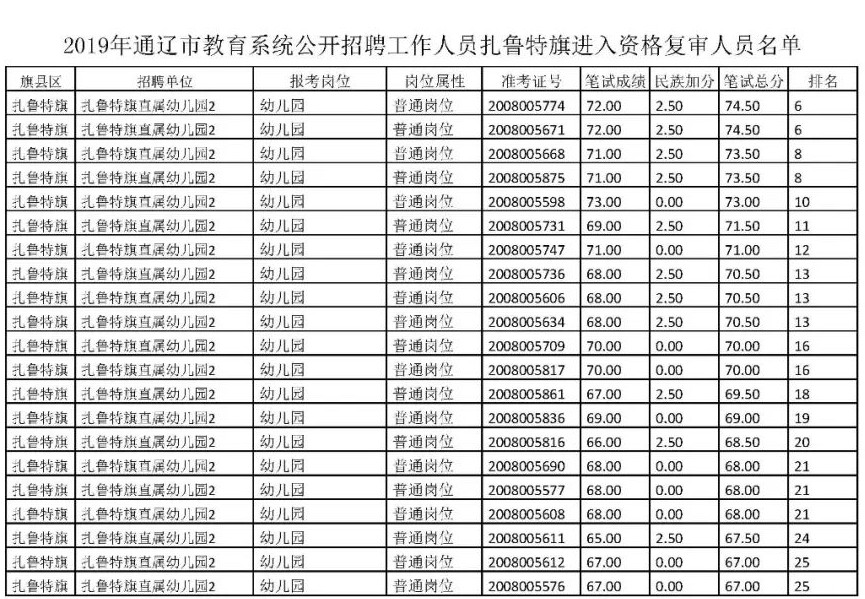 根据《2019年通辽市教育系统公开招聘工作人员简章》的要求,现将报考扎鲁特旗岗位进入资格复审人员名单进行公布。请进入资格复审的考生按照要求到扎鲁特旗教育科技体育局进行资格复审,凡不在规定时间进行资格复审的,取消面试资格。具体要求如下: