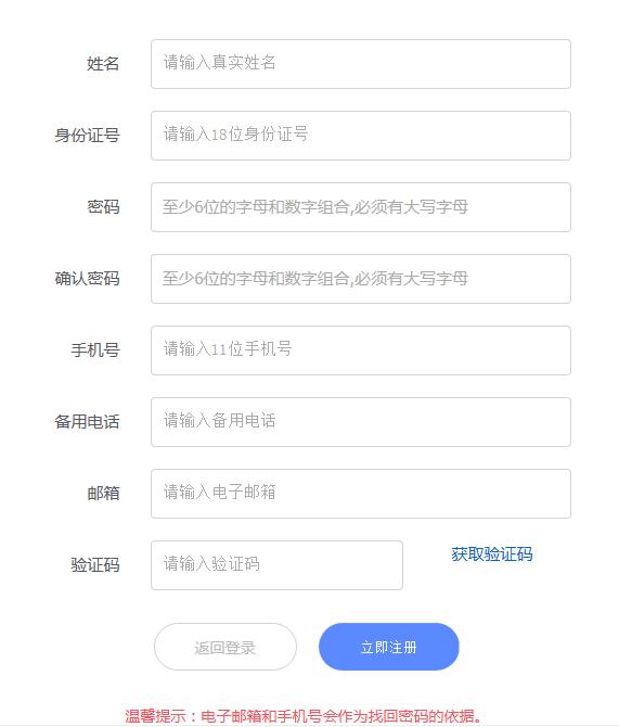 考生需要填写姓名、身份证、密码、手机号等个人信息先进行注册。注册成功后登录报名页面。