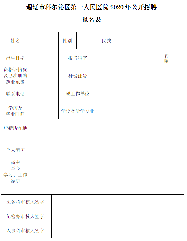 1、将附表二《通辽市科尔沁区第一人民医院2020年公开招聘报名表》填写完整。