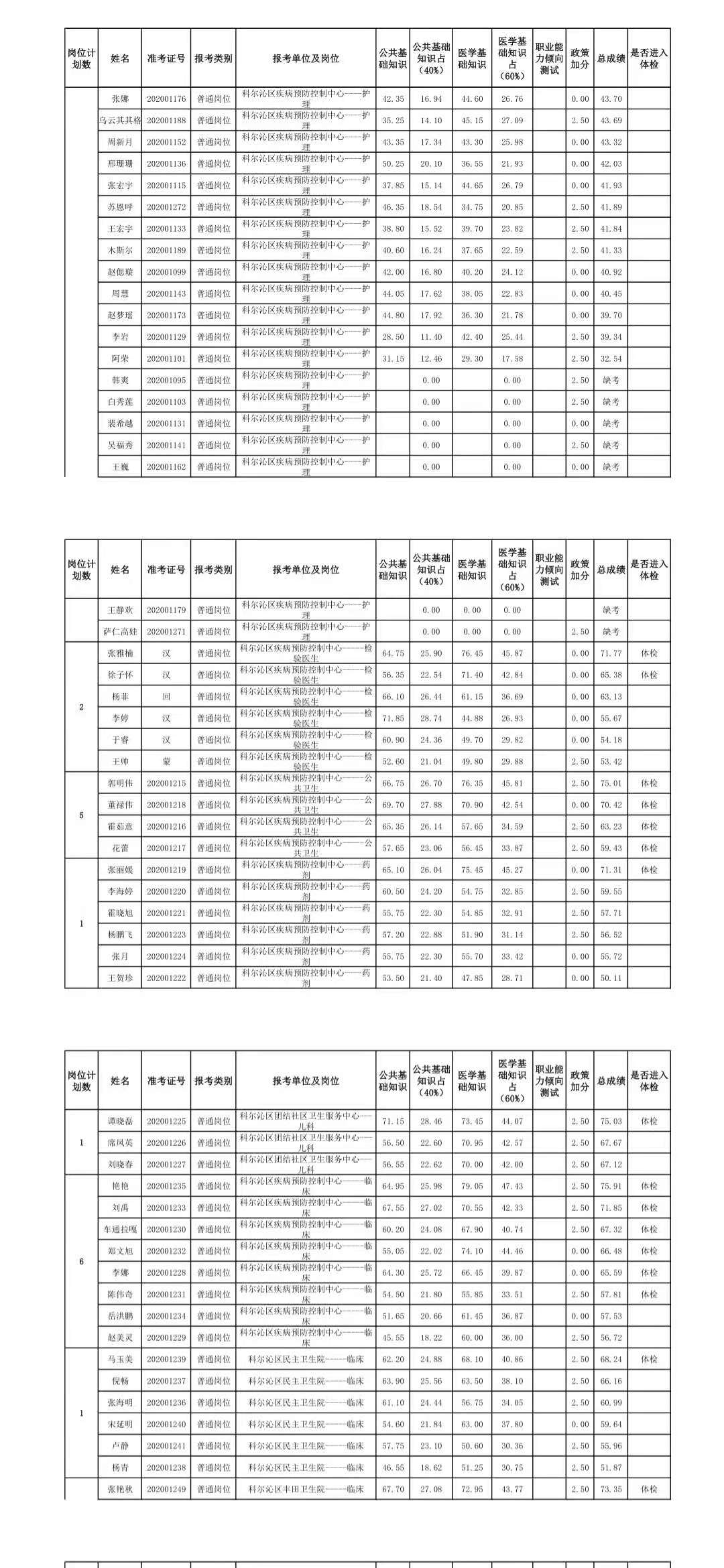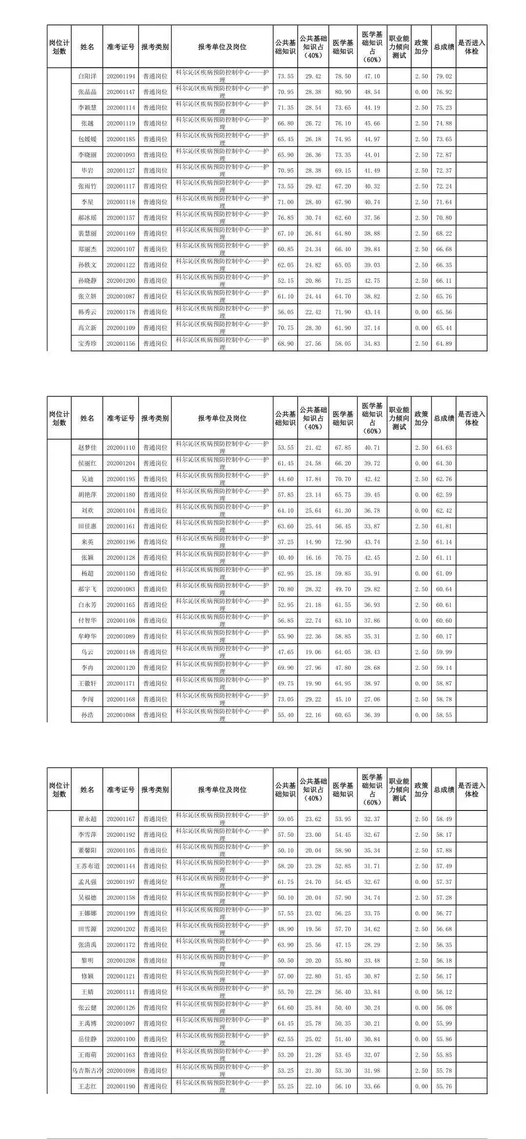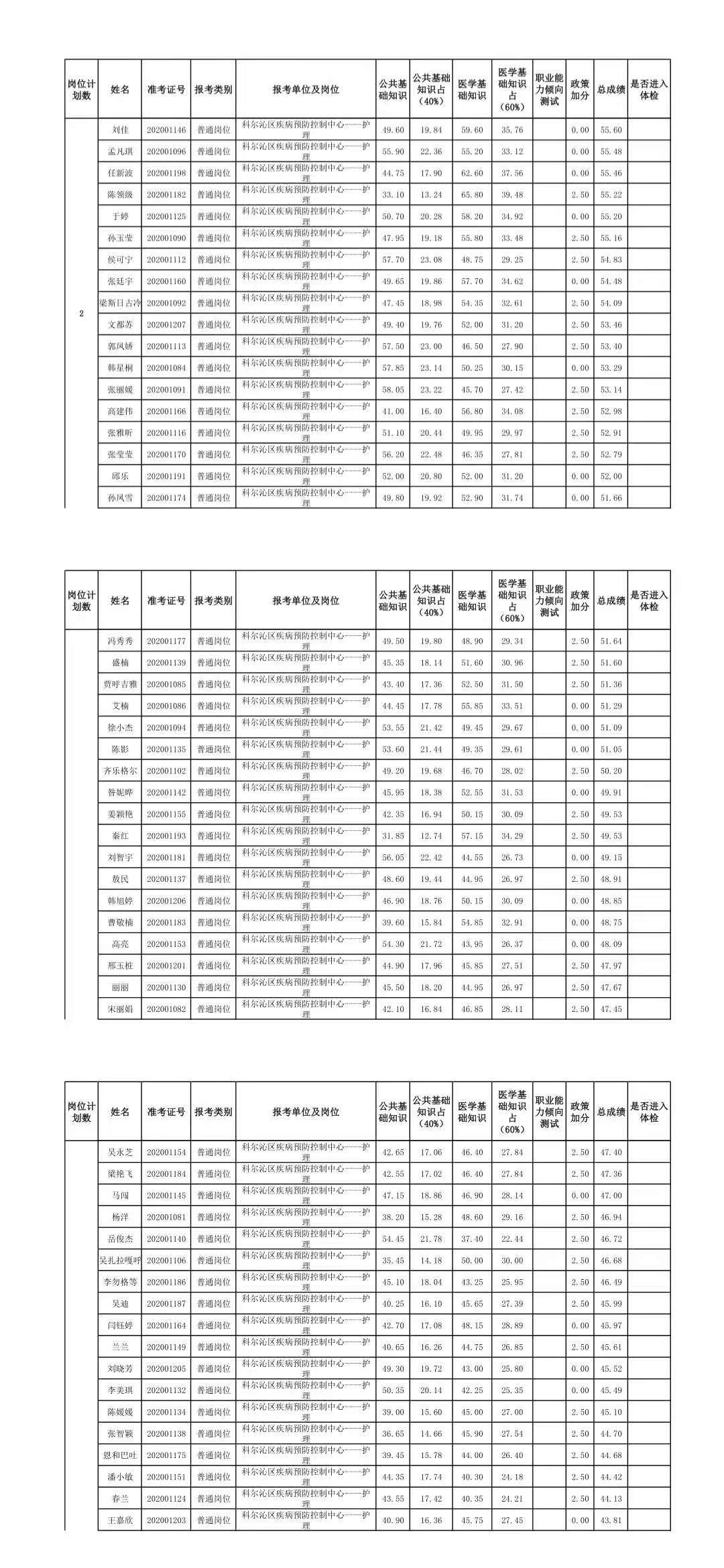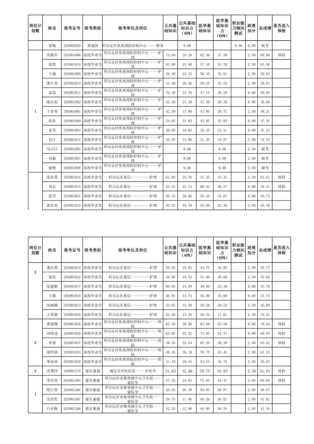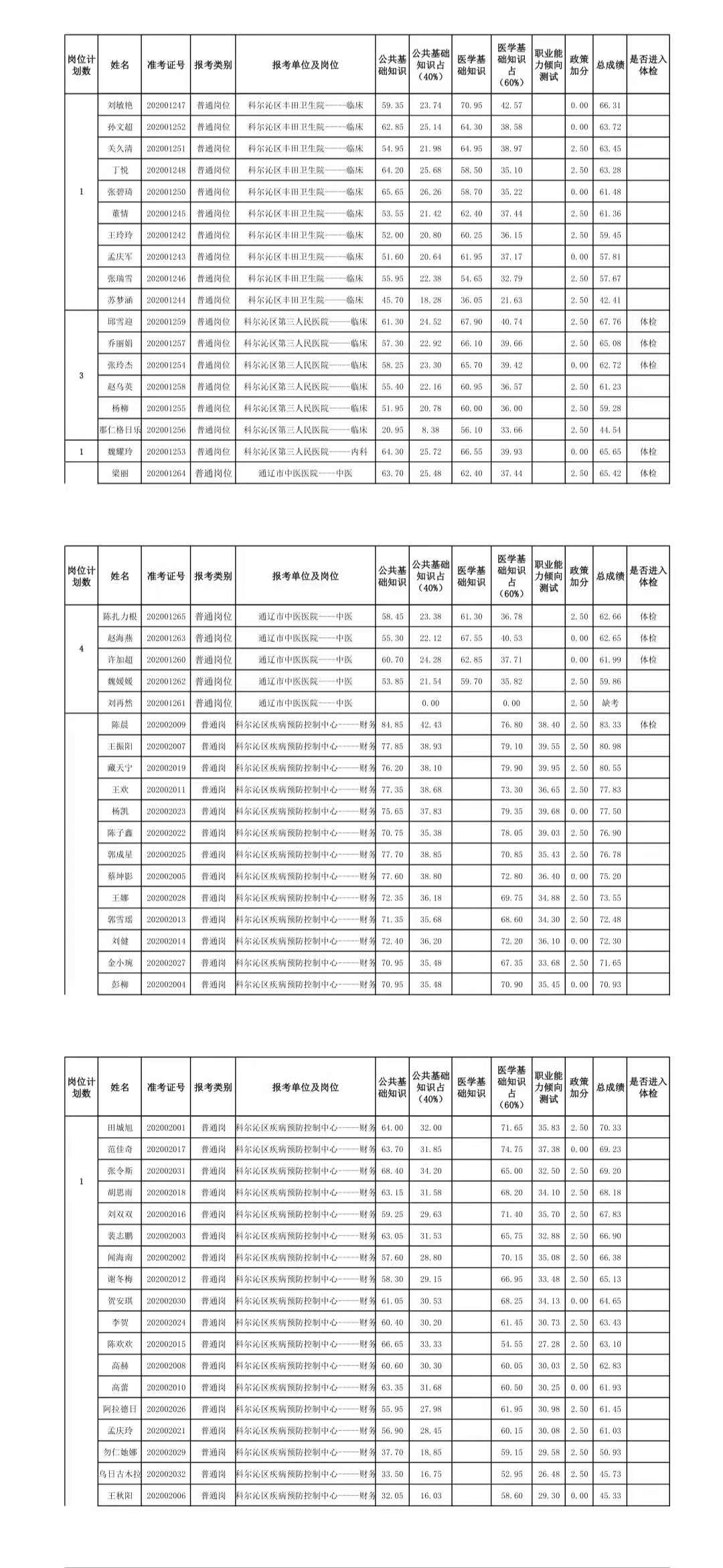 现将2020年通辽市科尔沁区卫生健康系统公开招聘工作人员笔试成绩予以公布(见附件)。根据《2020年通辽市科尔沁区卫生健康系统公开招聘工作人员简章》及笔试分数情况,经研究,确定医疗岗位笔试总成绩最低合格分数线(含民族加分)为50分(含50分),非医疗岗位笔试总成绩按成绩高低录取。进入体检人员请于2020年11月18日(周三)携带有效身份证件及一张蓝底小二寸照片,到科尔沁区第三人民医院四楼体检科进行体检。体检地址:平安路与明仁大街交汇处,科尔沁区第三人民医院(科尔沁区妇幼保健院)四楼体检科 体检时间:2020年11月18日上午8:00~11:20附件:2020年通辽市科尔沁区卫生健康系统公开招聘工作人员笔试成绩