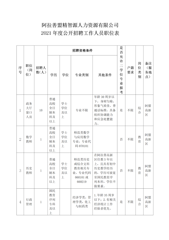 2.《职位表》中涉及的有关学历、学科、专业等资格条件方面的问题,由阿拉善盟精智源人力资源有限公司负责解释。