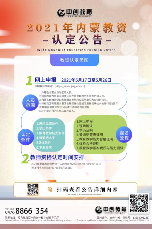 凡在我区2021年春季申请认定教师资格的人员,请于2021年5月17日至5月26日登陆“中国教师资格网”,从“教师资格认定申请人网报入口”,按照系统提示,进行注册和网上申报,逾期系统将自动关闭。要如实、准确填报本人信息并对信息的准确性负责。