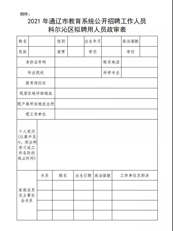 1.在职人员提供《干部人事档案》,无业人员提供《学籍档案》。3.居住地所在社区(村委会)和户籍所在地或居住地辖区派出所出具的无违法违纪证明材料,需下载附件《政审表》(此表正反面打印),出具部门填写意见并签字盖章。5.凭所在院系出具的证明参加资格审核的2021年应届高校毕业生,须提供毕业证、学位证、教师资格证原件及复印件。1.考察组审核拟聘用人员提供的学籍档案(或人事档案)及相关证件,了解被考核对象报名以来所提供的各类证件、经历是否真实有效、符合岗位要求。2.通过《政审表》《个人征信报告》了解其学习工作表现和遵纪守法等方面的实际情况。1.考察工作须本人携带相关材料到考察地点现场进行,未在指定日期内提交考察材料,视为自动放弃录用。2.需要给档案存放部门致函提取档案的人员,本人可在8月2日至4日工作时间内持有效二代身份证到区教体局401办公室,可配合出具借(调)档函。附件:2021年通辽市教育系统公开招聘工作人员科尔沁区相关岗位政审表