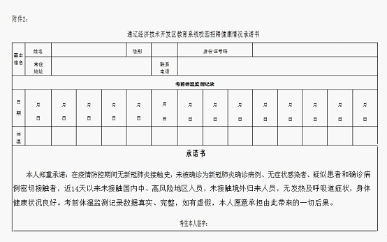 (三)考生应做好身体健康状况监测。即日起考生记录体温测量结果,并填写《通辽经济技术开发区教育系统校园招聘健康情况承诺书》(附件),参加面试时须上报给考点,方能参加面试。