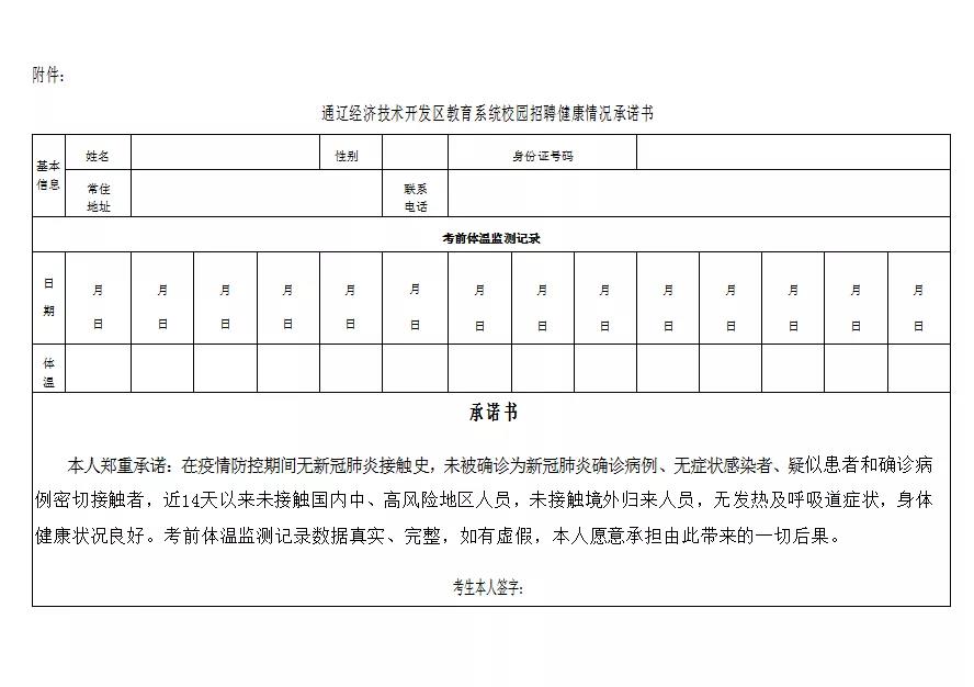 (三)考生应做好身体健康状况监测。即日起考生记录体温测量结果,并填写《通辽经济技术开发区教育系统校园招聘健康情况承诺书》(附件),参加面试时须上报给考点,方能参加面试。