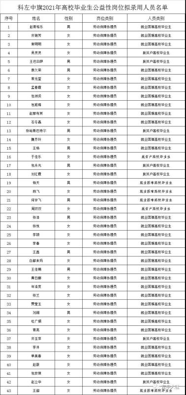 附件:科左中旗2021年高校毕业生公益性岗位拟录用人员名单