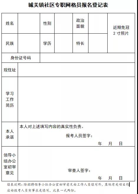 1.《城关镇社区专职网格员报名登记表》一式二份;