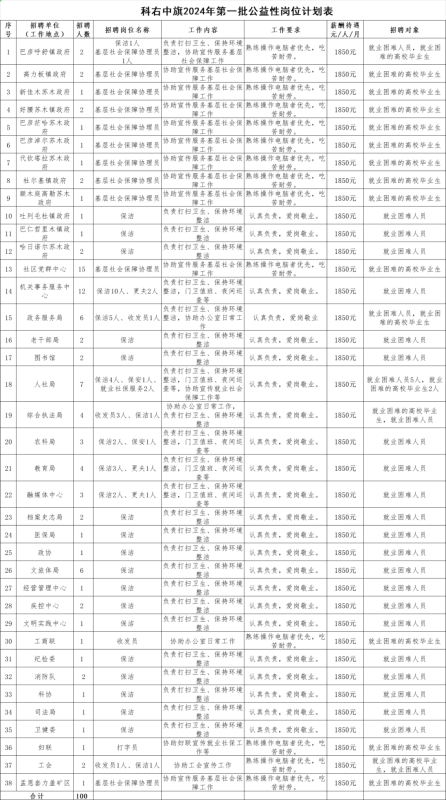 为进一步落实就业困难人员就业工作,有效促进就业困难人员就业,根据内蒙古自治区人力资源和社会保障厅《关于进一步做好公益性岗位开发管理有关工作的通知》(内人社办发〔2020〕50号)、《关于印发〈内蒙古自治区就业困难人员认定办法〉的通知》(内人社办发〔2020〕58号)以及按照盟人社局关于印发《2024年度兴安盟第一批公益性岗位开发计划的通知》(兴人社办发〔2024〕59号)文件要求,结合我旗实际情况,现面向社会公开招聘公益性岗位100人,具体事宜公告如下: