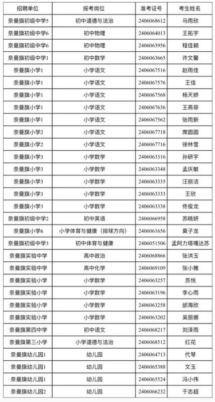 根据《2024年度通辽市教育系统公开招聘工作人员公告》要求,经过笔试、面试、体检、考察等环节,现对2024年度通辽市教育系统公开招聘工作人员(奈曼旗岗位)应届毕业生拟聘用工作人员予以公示。